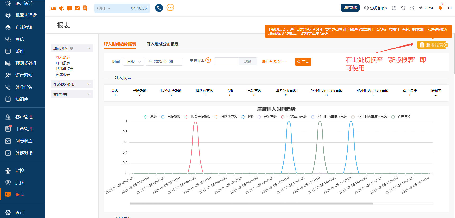 注:之前自定义查询跨天时,最小单位是‘天’,跨天无法查询指定时间内的数据,本次优化后已解决此问题。现‘报表-通话报表’已全部升级完毕,进入详情页后,请点击切换‘新版报表’,即可使用相关功能。