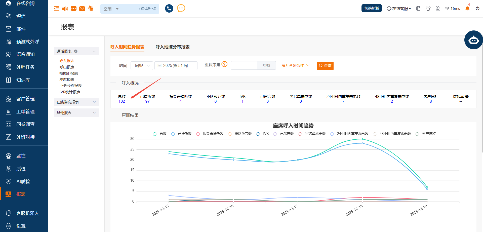 功能描述:支持点击 【呼入报表】“呼入概况” 中的统计数据,直接跳转至【语音通话】模块查看对应明细数据。简化数据查询流程,无需手动切换模块筛选,提升数据溯源效率。