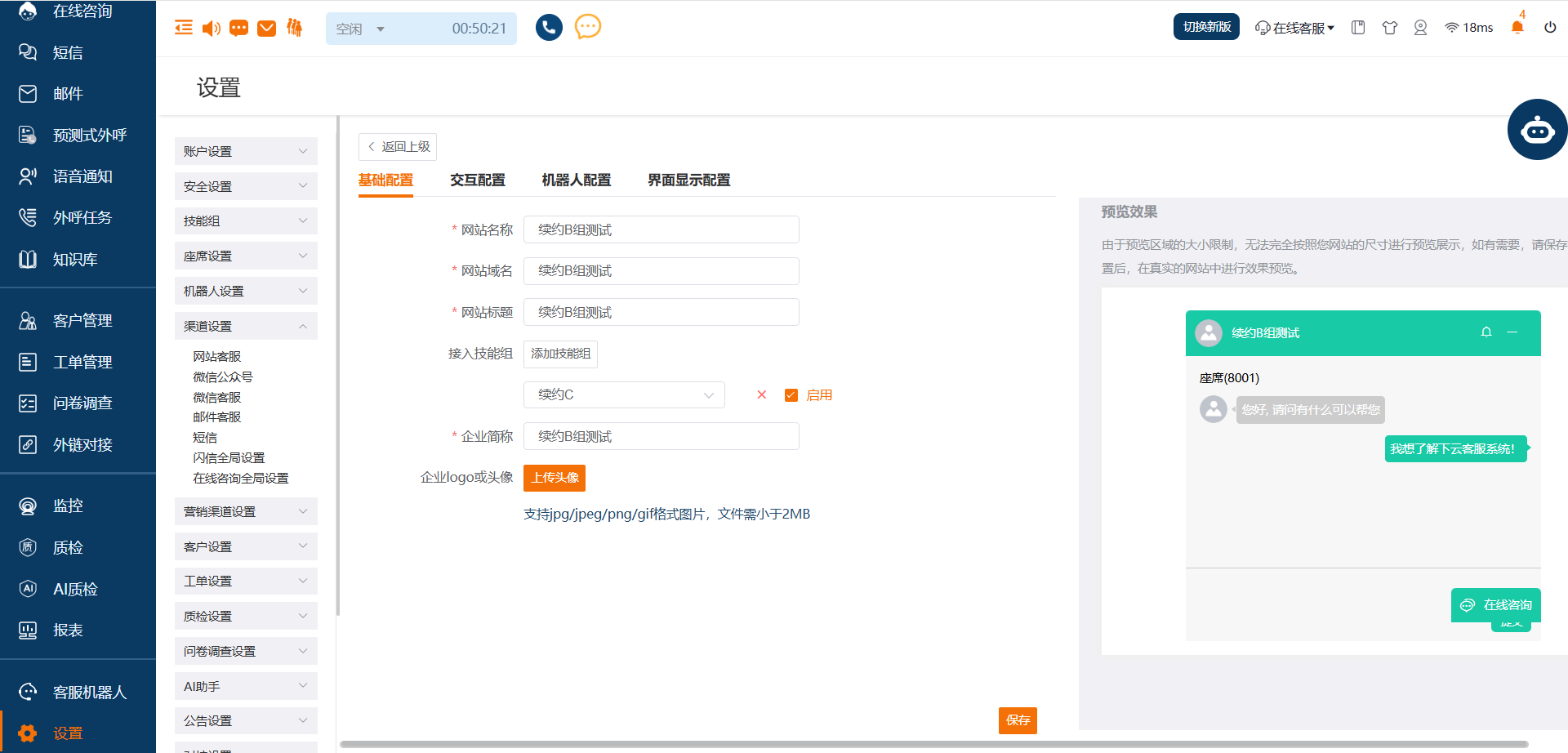 功能描述:将配置页面按功能属性拆分为 “基础配置、交互配置、机器人配置、界面显示配置” 四大标签页,独立承载对应场景的功能配置项,便于快速找到目标配置项,降低学习成本,提升配置效率。