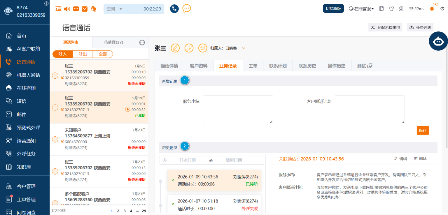 ①新增记录(当前仅开放于「语音通话、通话弹屏」):区域内自动展示「客户设置 - 业务记录」中已启用的字段,支持填写本次通话的服务内容;提交时将自动绑定当前通话,实现记录与通话的精准关联。